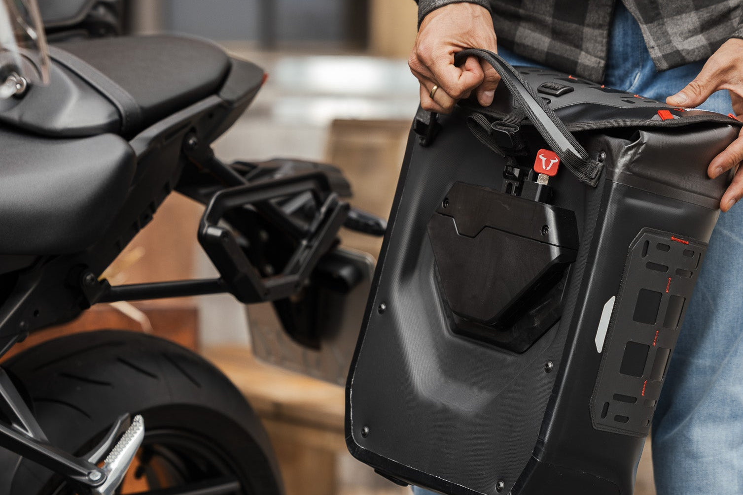 The V-LOC Side Carrier with integrated Fidlock® magnetic system and the corresponding side bags from the Legend Gear and WP series.