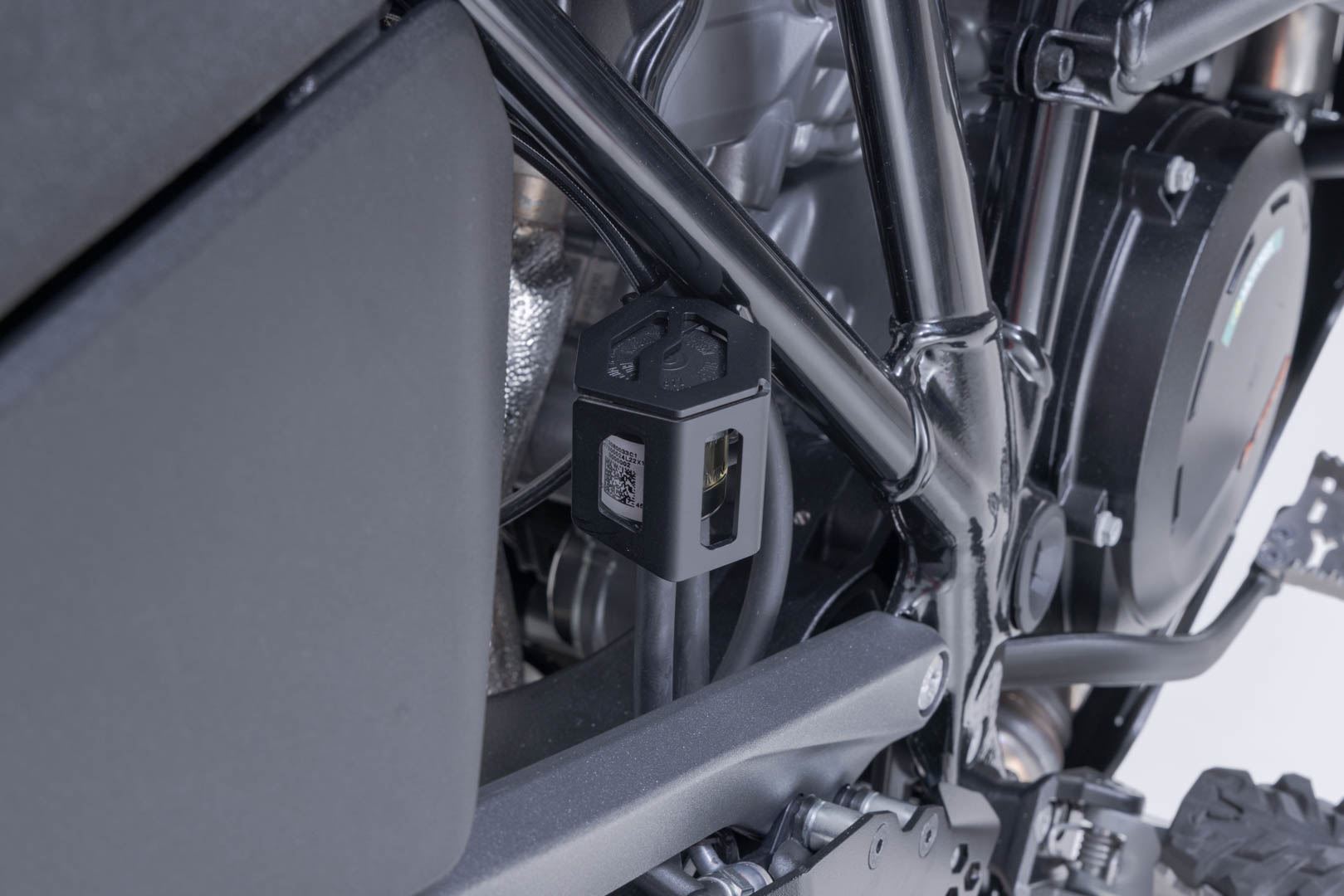 The compact brake reservoir guard protects the original brake reservoir from rock chips and simultaneously prevents unwanted removal of the cover. The protector can be installed on the motorcycle in a few simple steps.