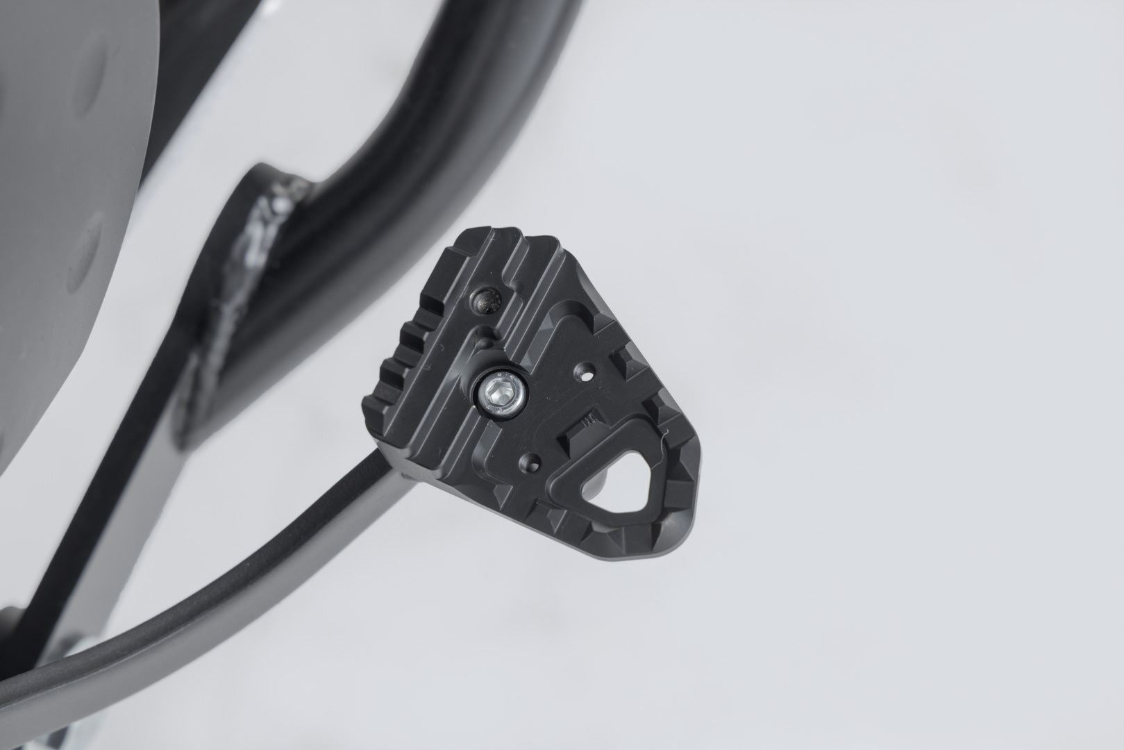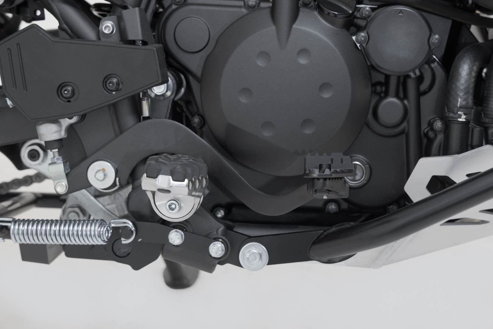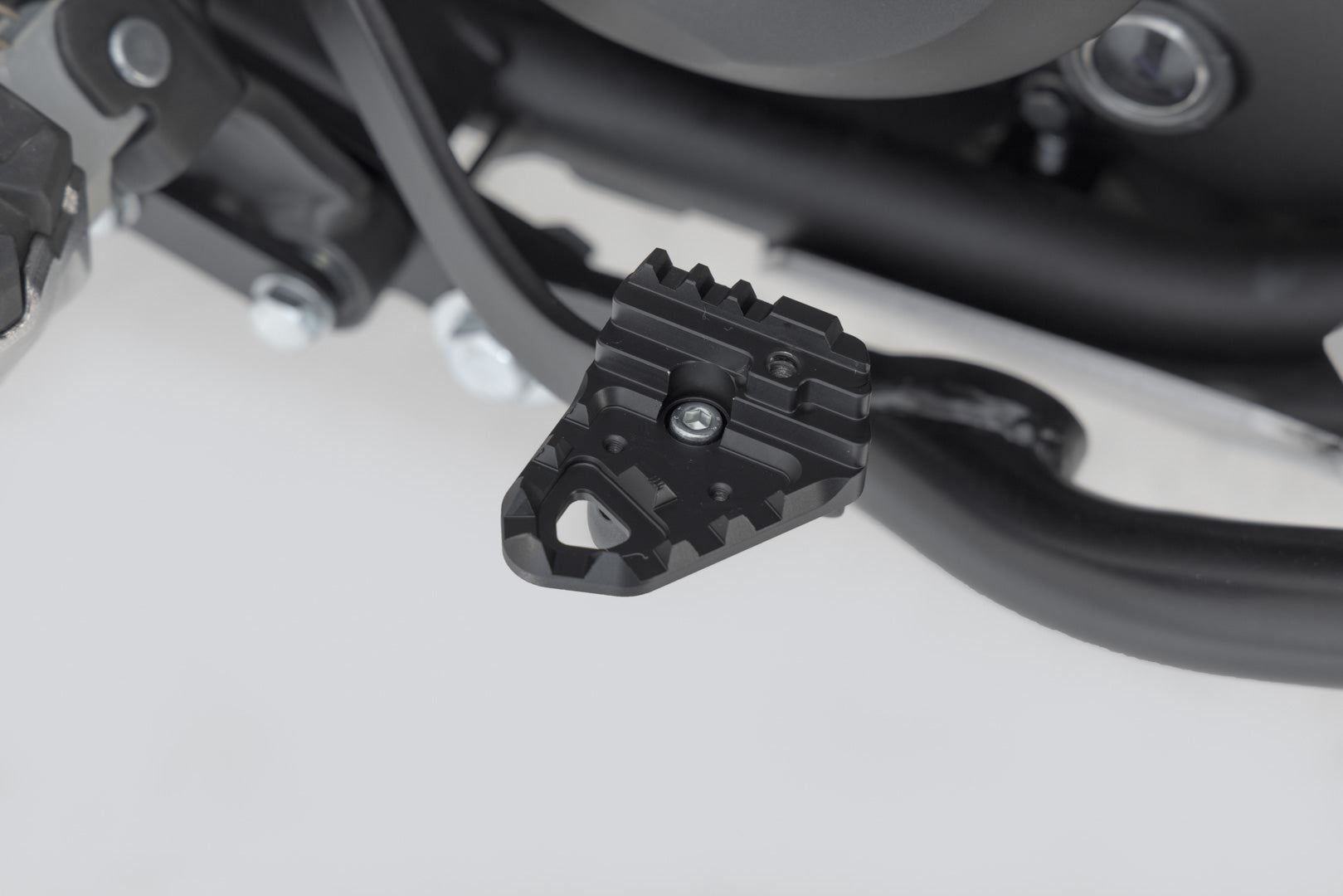 SW-MOTECH manufactures these extensions from high-strength milled aluminum alloy; they feature a black anodized surface and a stainless steel step plate. For optimal ergonomic adjustment, the increase in the brake pedal step can be adjusted in two stages of 22 or 27 millimeters.