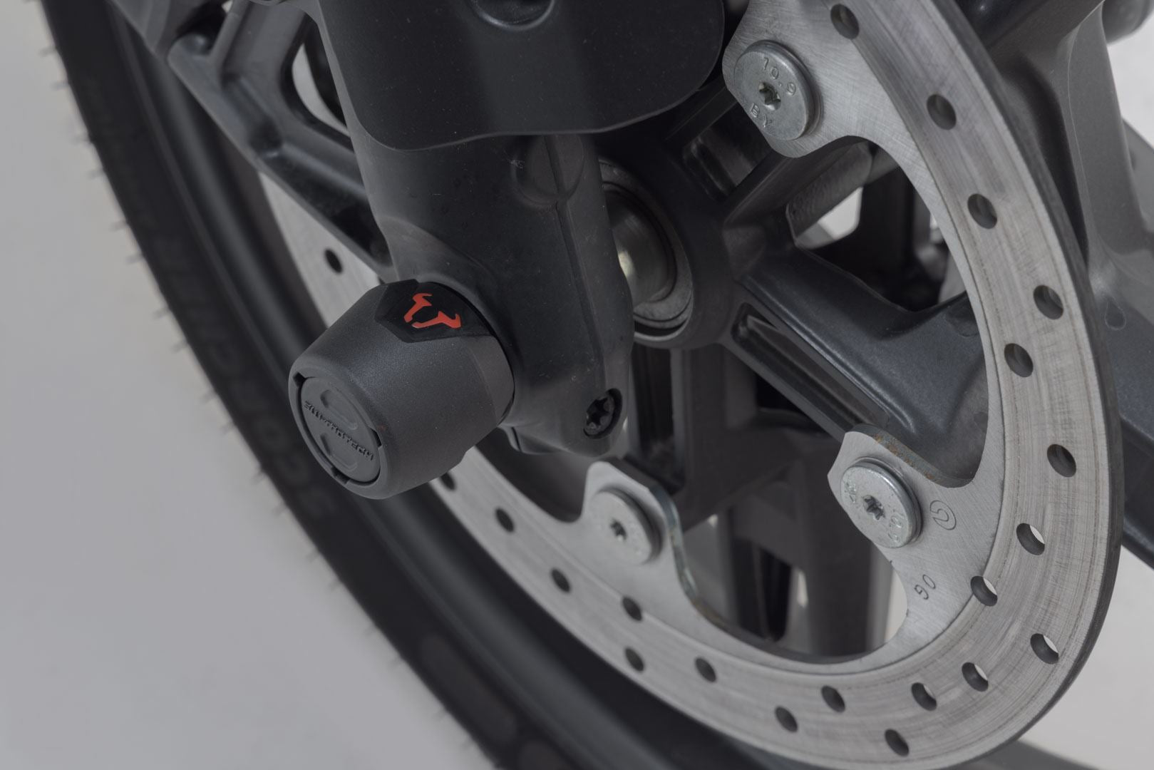 The front axle crash pads made of abrasion-resistant plastic protect the drive shaft from damage in the event of a fall. The smooth surface also provides excellent sliding properties. The polished bull logo in red adds a visual highlight to your motorcycle.