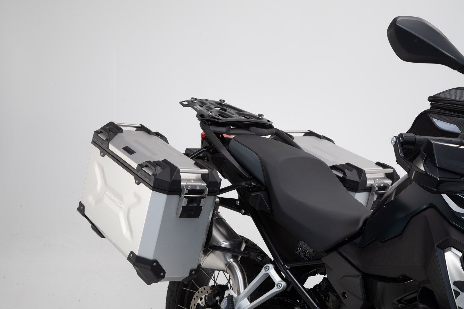 Durable TRAX ADV aluminum cases feel at home on any stretch of road: embossed patterns add stability to the 1.5 millimeter-thick, welded aluminum wall material. A completely removable lid with carrying handles made of anodized aluminum and quick release fasteners makes loading and unloading of motorcycle luggage easier; the beveled side edge provides high ground clearance when cornering. With this complete solution, you have all the components you need to travel with TRAX: two waterproof TRAX ADV side cases, two detachable SW-MOTECH side carriers, adapter kit, lock set, lid limiter and anti-theft protection at an attractive price.