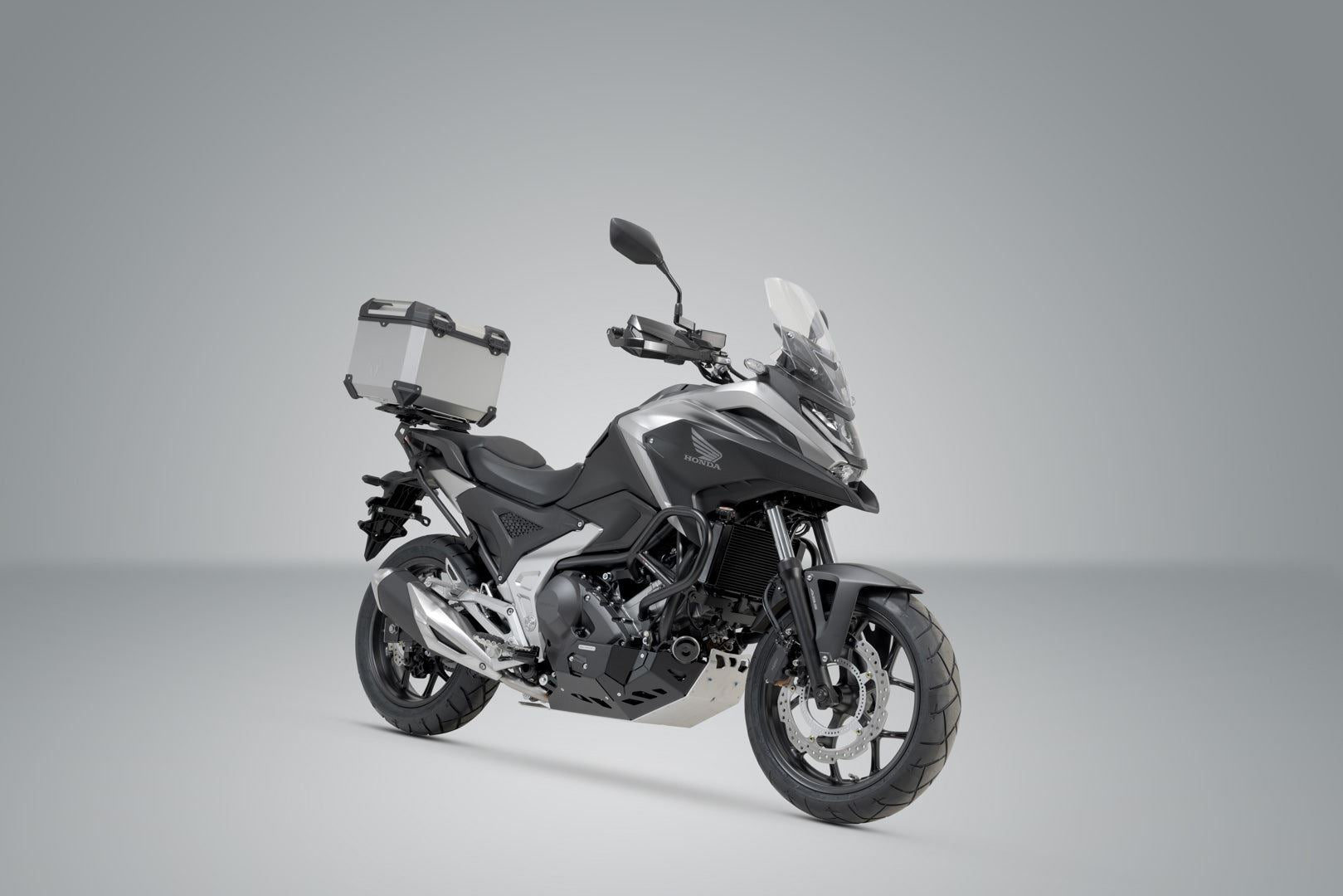 The TRAX ADV top case system consists of a sturdy silver top case and the matching STREET-RACK for the Honda NC 750 X.